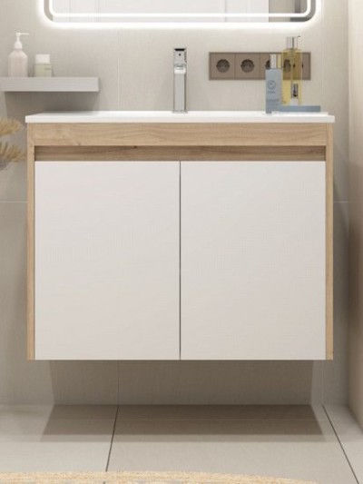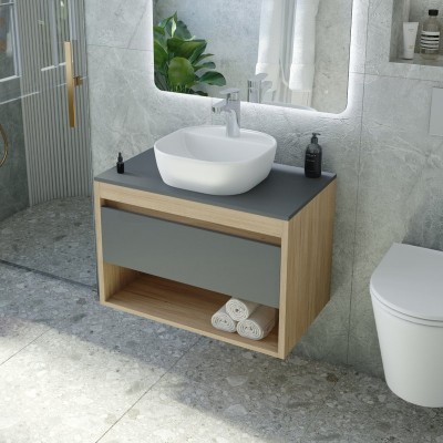 - Комплектация: Тумба под раковину со столешницей Тумба подвесная Teymi Ritta 65, ящик с доводчиком, цвет дуб эврика/белый матовый T60520; Накладная раковина Раковина накладная Teymi Solli 40 с полочкой под смеситель, белая T50207