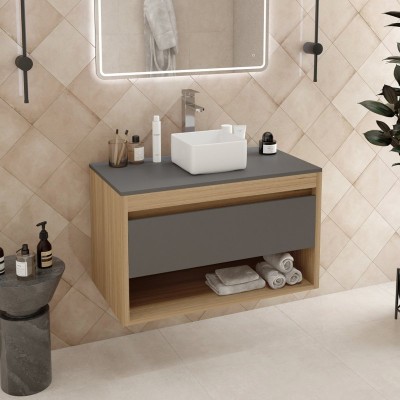 - Комплектация: Тумба под раковину со столешницей Тумба подвесная Teymi Ritta 75, ящик с доводчиком, цвет дуб эврика/белый матовый T60521; Накладная раковина Раковина накладная Teymi Solli 40 с полочкой под смеситель, белая T50207
