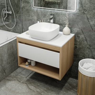- Комплектация: Тумба под раковину со столешницей Тумба подвесная Teymi Ritta 75, ящик с доводчиком, цвет дуб эврика/графит матовый T60525; Накладная раковина Раковина накладная Teymi Solli 41 artceramic, белая T50203