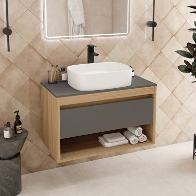 - Комплектация: Тумба под раковину со столешницей Тумба подвесная Teymi Ritta 85, ящик с доводчиком, цвет дуб эврика/графит матовый T60532; Накладная раковина Раковина накладная Teymi Iva 46, белая T50606