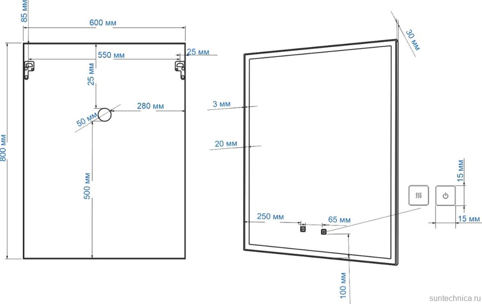 • Дополнительная информация: по периметру зеркала профиль из алюминия, задняя часть корпуса закрыта пластиком, возможность переключения типа подсветки - теплый (2700 К) или холодный свет (6000 K)